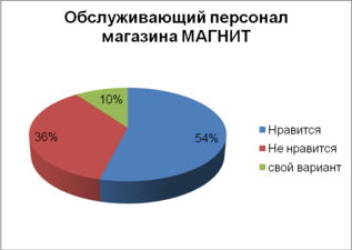 Обслуживание является важной составляющей работы магазина. Из рис.8 мы видим, то, что 54% опрашиваемых нравится обслуживание в магазинах "Магнит".36% не устраивает обслуживание персонала, они считают, то, что продавцы-консультанты не достаточно вежливы, аккуратны и квалифицированны.10% покупателей отметили, что на кассах создаются большие очереди, это связано с тем, что не все кассиры находятся на рабочем месте. Это очень замедляет процесс расчета за покупки.