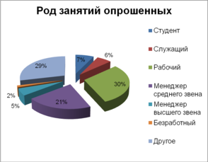 Из рис.14 следует, что 30% опрошенных рабочие, 29% указывали свой вариант ответа, в основном это были пенсионеры, домохозяйки.21% респондентов являлись менеджеры среднего звена,7% - студенты.