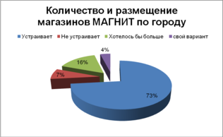 Одним из преимуществ сети магазинов "Магнит" является, что они расположены во всех районах нашего города, и не ограничиваются на одном магазине в районе. Соответственно, 73% опрашиваемых устраивает количество и размещение магазина "Магнит" по городу.16% считает, что нужно увеличить их количество.4% не задумывались о количестве и размещении магазинов по городу, так как они предпочитают посещать "Магнит" рядом с домом.