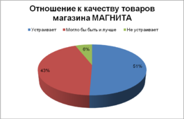Опрос показал, что 51% покупателей устраивает качество товаров, 43% ответили, что могло бы быть и лучше, например, на такие товары, как молочные продукты, колбасные изделия. И лишь 7% опрашиваемых не довольны качеством товара. Такие показатели служат основанием полагать, что качество товаров в магазине устраивает покупателей.
