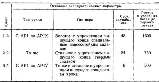 По терміну служби ці ручки ділять на 2 класи: 1-й клас — 48 міс. з ресурсом висувного механізму до першої відмови в циклах РШИ —32 000, РШШ —20 000 для одного вузла, що пише, і 25 000 для всіх вузлів, що пишуть; 2-й клас — 24 міс. з ресурсом висувного механізму до першої відмови РШН — 16 000, РШШ — 10 000 для одного вузла, що пише, і не більше 7500 для всіх вузлів, що пишуть. Середній ресурс тримача — 16 000 і 7500 відгинів на 2,5 мм.
