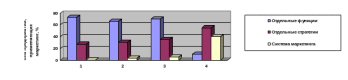 Как видно из сложившейся ситуации, менее гибкими в условиях развития рыночных отношений оказываются колхозы и совхозы. Более 70% хозяйств первой группы используют отдельные функции маркетинга, около 30% осуществляют маркетинговую деятельность, направленную на реализацию товарной и сбытовой стратегий, всю систему маркетинга не применяет ни одно сельскохозяйственное предприятие. Среди перерабатывающих и предприятий новых форм хозяйствования (акционерные общества, ассоциации, агрофирмы) систему маркетинга реализуют более 3%; почти треть функционируют на рыночных принципах. Тем не менее, большинство предприятий второй и третьей групп (более 65%) применяют лишь функции маркетинга.[2.c.7]