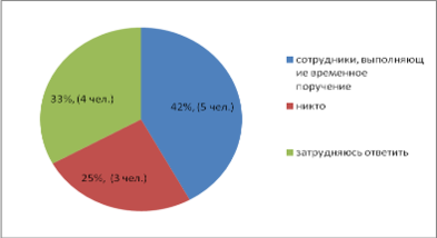 42% (5 чел.) опрошенных ответили, что за деятельность по формированию имиджа и корпоративной культуры Калужского Дома музыки отвечают сотрудники, выполняющие временное поручение, 25% (3 чел.) ответили, что такая деятельность не координируется никем и 33% (4 чел.) затруднились ответить на этот вопрос. Полученные данные свидетельствуют о том, что на данный момент в Калужском Доме музыки нет сотрудника, ответственного за деятельность по формированию имиджа и корпоративной культуры организации. Такая деятельность либо не координируется вообще, либо координируется сотрудниками, выполняющими временные поручения, что говорит о стихийном характере формирования имиджа и корпоративной культуры Калужского Дома музыки.