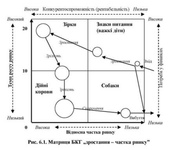 Аналогічно, «знаки питання» повинні збільшувати частку ринку, хоча окремі з них перетворюються в «собак» і вибувають;