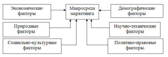 Факторы макросреды, влияя на всю совокупность хозяйствующих на данном рынке субъектов, определяют основные принципы и условия деятельности фирмы, поэтому они должны учитываться в первую очередь, так как негативные последствия здесь могут быть наиболее серьезными. Макросреда определяется факторами:
