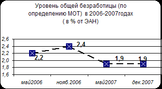 Общая численность безработных (в соответствии с методологией МОТ) на конец 2007 года составила 53,0 тыс. человек. Уровень общей безработицы, рассчитанный как отношение общей численности безработных к численности экономически активного населения, не превышал 1,9%.