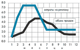 График иллюстрирует зависимость изменений — увеличение годового объема рекламы в 4 раза привело к росту объемов реализации в 2.5 раза.