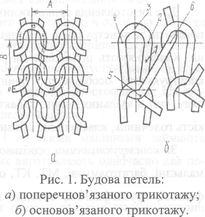 На рис. 1 наведено схему будови петель поперечно- і основов'язаного трикотажу. Петля поперечно-в'язаного трикотажу (рис. 1a) складається з двох прямих відрізків (1-2,4-5), які називаються петельними паличками, та голкової дуги (2-3-4), яка утворює їх остов. Ділянка петлі (5-6-7) у вигляді платинних дуг утворює протяжки, що з'єднують остови суміжних петель. Петля основов'язаного трикотажу (рис. 1б) складається з остова (1-2-3-4-5) і протяжок (5-6), які з'єднують остови двох суміжних петель. Петлі, розміщені в одному горизонтальному ряду (впоперек трикотажу), утворюють петельний ряд, а петлі, нанизані одна на одну впродовж трикотажу, петельний стовпчик.