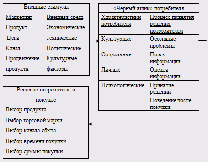 Ключ к пониманию потребителя скрыт в "черном ящике" внутренних побудительных мотивов, предопределяющих процесс принятия решений в отношении приобретения конкретного продукта. В конце концов, исследование потребителя — это изучение механизма "черного ящика", в котором заключается структура нужд, запросов и предпочтений потребителя. Именно на ее изучение и направлен инструментарий маркетинга.