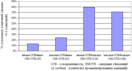 "В ходе исследования, проведенного компанией MCColum/Spielman, было установлено, что гораздо большей эффективностью обладают ролики, вызывающие повышенные ожидания к товару (смещение отношения к товару) (показатель "СМ-ОТН"), чем ролики с хорошими показателями формирования осведомленности о марке, показатель "ОСВ" (диаграмма 1).