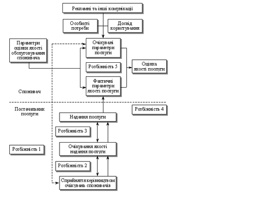 Модель якості обслуговування наведено на рис. 2.3. У верхній її частині — опис чинників, які визначають очікування та попит на послуги, у нижній — процес створення сервісного обслуговування підприємствами-виробниками та їхніми торговими посередниками. Модель якості може допомогти проаналізувати розбіжності, що можуть виникнути у процесі надання послуг. Завдання виробника та його посередників полягає в тому, щоб ідентифікувати й зменшити розбіжності, виявлені у процесі аналізу, та визначити значні перешкоди у наданні споживачеві якісних послуг.