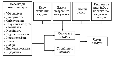 Головним завданням забезпечення якості послуги — задоволення або перевищення рівня очікувань споживача(Рис.2.2.) . У споживача виробляється очікування послуги, яке базується на минулому досвіді, на ціні, яку він сплачує за послугу певної якості, та на інших чинниках. У такому разі задоволення потреб залежить від різниці між послугою, яку споживач очікує отримати, та послугою, яку він дійсно отримує.