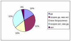На 12 вопрос: «Довольны ли Вы оформлением товара?», голоса распределились следующим образом: 1. «скорее да, чем нет» и «скорее нет, чем да» по 8 человек (32%); 2. «да» и «мне безразлично» по 4 человека (16%); 3. «нет» - 1 человек (4%). См. рис.5.