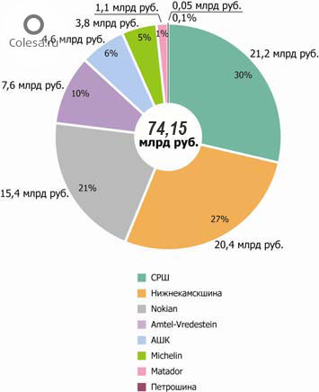 Во многом за счет высокой доли в объеме выпуска относительно дорогой брендированной продукции лидером по производству стала «СИБУР – Русские шины», с 30% в общем объеме производства (в денежном выражении). На второй позиции – Нижнекамскшина, с долей в 27% от общего объема производства. Заметно выросла доля Nokian - 21%. Ослабли позиции компании Амтел - в 2009 году доля компании в объеме выпуска не превысила 10%. Алтайский шинный комбинат занял 6%, Michelin – 5%. Доля прочих производителей была минимальной.