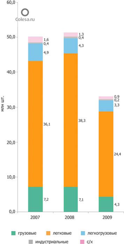 В разрезе отдельных продуктовых групп наибольшие потери наблюдались в сегменте рынка шин для полноразмерного грузового транспорта и автобусов, чья емкость в 2009 году сократилась на 40% по отношению к предыдущему году. На 36% процентов сократились сегменты легковых и индустриальных шин. Падение рынка шин для сельхозтехники составило 34%. Менее других потерял сегмент шин для легкогрузового транспорта – 24% от уровня 2008 года.