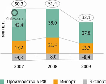 Динамика емкости рынка шин РФ по каналам поступления продукции в 2007-2009 гг., млн. шт.