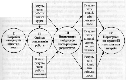 Після визначення еталонів щодо власного підприємства проводять аналіз розривів (невідповідностей), на основі якого компанія може порівняти свої теперішні показники з потенційними, а потім визначити ті сфери, в яких необхідно досягти поліпшення. Як показано на рисунку 5, аналіз розривів складається з чотирьох етапів: встановлення стандартів ефективності; оцінки результатів роботи (як даної компанії, так й інших підприємств); визначення різниці (невідповідності) результатів (функціонує компанія краще, так само або гірше, ніж бажалося б) і коригування стратегії і тактики у разі потреби.