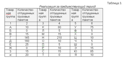 Рассмотрим в качестве примера склад, ассортимент которого включает 27 позиций (табл. 3, позиции а, б, в,..., я). Предположим, что груз хранится в стеллажном оборудовании на поддонах в пакетированном виде, отпускается целыми грузовыми пакетами, и все операции с ним полностью механизированы. Всего за предшествующий период (например, за прошлый месяц) было отпущено 945 грузовых пакетов.