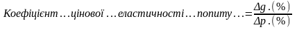 Цінова еластичність попиту визначає чутливість покупців до змін в цінах. Цінову еластичність можна визначити як відношення зміни величини попиту (у відсотках) до зміни цін (у відсотках):