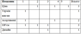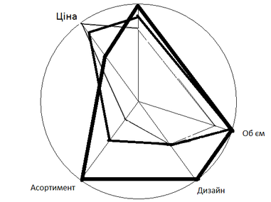 - «Бджілка»: Ціна = 0,85;Термін вик-ня = 0,83;Асортимент = 0,66; Об’єм =1; Дизайн=0,66.