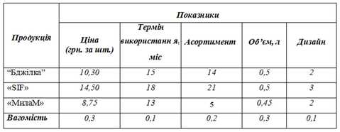 Отже, у порядку зниження рівня конкурентоспроможності товари розташувалися так: “SIF” (0,1189), “Бджілка” (0,16367), “МілаМ” (0,1901).