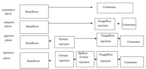 Рівень каналу розподілу – це будь-який посередник, який виконує ту чи іншу роботу по зближенню товару та права власності на нього кінцевому покупцеві. [11. ст.442]