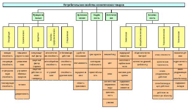 Косметические товары придают красивый внешний вид и здоровое состояние коже и волосам и поэтому имеют большое гигиеническое, эстетическое и психологическое значение. Они очищают, увлажняют, питают, укрепляют, защищают от неблагоприятных факторов природы, устраняют воспалительные процессы. Потребительские свойства косметических средств в целом можно разделить на следующие основные группы: