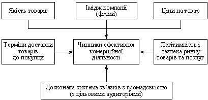 Із запропонованого визначення комерційної діяльності логічно випливає висновок, що її стрижнем є налагодження і здійснення взаємовідносин з покупцями, які значною мірою залежать від якості товарів, цін на товари, термінів доставки товарів до споживача, а також репутації компанії (корпорації, підприємства, фірми), її іміджу (схема 1).