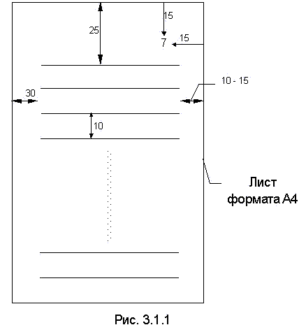 Длина машинописной строки на листе формата А4 должна составлять 60-65 знаков, считая пробелы между словами за один знак. Размер абзацного отступа – пять знаков (15-17 мм). На странице сплошного текста должно быть отпечатано не более 28 строк. Расстояние между строками 10 мм (рис. 3.1.1).