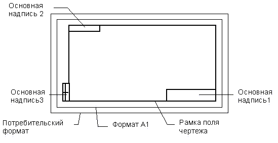 Графическое изображение должно занимать не менее 75 % листа. В зависимости от расположения изображений лист формата А1 можно располагать вертикально либо горизонтально. На листе потребительского формата определяют центр и относительно него вычерчивают тонкой сплошной линией границу формата А1 (841 х 594), затем от линии формата проводят рамку поля чертежа сплошной основной линией, как показано на рисунке 3.6.1.
