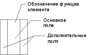 Схемы изделий цифровой вычислительной техники выполняют в соответствии с правилами, установленными ГОСТ 2.708-81, и с учётом требований ГОСТ 2.701-84, ГОСТ 2.702-875, ГОСТ 2.721-74. Условные графические обозначения выполняют по ГОСТ 2.743-82 «ЕСКД. Обозначения условные графические в схемах. Элементы цифровой техники». Обозначения элементов строят на основе прямоугольника. В общем виде условное графическое обозначение может содержать три поля: основное поле и два дополнительных поля, расположенных по обе стороны от основного (рисунок 3.10.2). Размер прямоугольника по ширине зависит от наличия дополнительных полей, и числа, помещённых в них знаков (меток, обозначение функции элемента); по высоте – от числа выводов, интервалов между ними и числа строк информации в основном и дополнительном полях. Ширина основного поля должна быть не менее 10, дополнительных – не менее 5 мм, расстояния между выводами – не менее 5 мм и кратное этой величине, между выводом и горизонтальной стороной обозначения – не менее 2,5 мм и кратно этой величине [3].