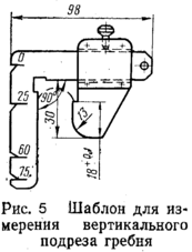 Изношенный гребень колеса может вызвать сход вагона с рельсов, в особенности на противошёрстных стрелках. Поэтому к работе под вагонами не допускаются колёсные пары, имеющие вертикальный подрез гребня, верхний край которого находится на расстоянии 18мм и более от поверхности катания колёс. Для выявления вертикального подреза гребня применяют специальный шаблон (рис.5). Колёсную пару бракуют, если вертикальная поверхность движка соприкасается хотя бы только в верхней части с подрезанной поверхностью гребня.