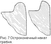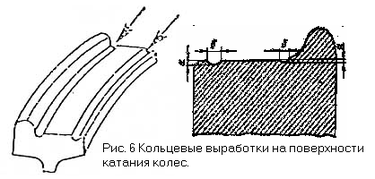 Кроме перечисленных выше неисправностей колёс, также нередко встречаются на поверхности катания кольцевые выработки (рис.6), смещение металла и остроконечный накат на участке сопряжения подрезанной части гребня с его вершиной (рис.7) .Кольцевая выработка допускается у основания гребня глубиной не более 1 мм и на уклоне 1:7 не более 2 мм или шириной б не более 15 мм. Смещение метала (навар) допускается высотой у колёсных пар пассажирских вагонов не более 0,5мм.