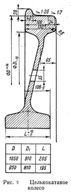 При обточке поверхностей катания цельнокатаных колёс (рис.9) снимают наименьшее количество металла, нужное для получения нормального профиля. Обтачивают гребень, поверхность катания и при необходимости внутреннюю грань обода цельнокатаного колеса. Класс шероховатости обработки профиля катания, наружной фаски, гребня и внутренней грани должен соответствовать стандартному эталону чистоты.