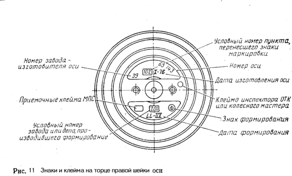 При формировании колесных пар из новых и старогодных элементов клейма и знаки наносят на торце оси с правой стороны колесной пары (рис.11). Правой стороной колесной пары считается та, на торце оси которой находятся знаки и клейма, относящиеся к изготовлению оси. При полном освидетельствовании знаки и клейма ставят на левом торце оси колесной пары (рис. 12). Нанесение контрольных окружностей и разбивку секторов клеймения колесных пар производят согласно рисунку 11.