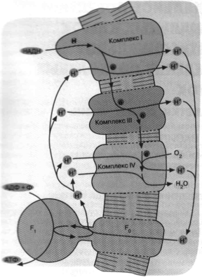 Рис.7. Механизм дыхательного фосфорилирования в аэробных бактериях и митохондриях. Фер­ментные комплексы I, III и IV катализируют пере­нос электронов от НАДН к О2 с образованием во­ды. Перенос электронов сопряжен с откачкой ионов Н*. Возвращение ионов Н+ через F0F1 приво­дит к синтезу АТФ