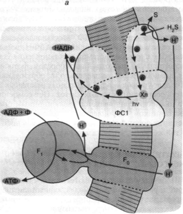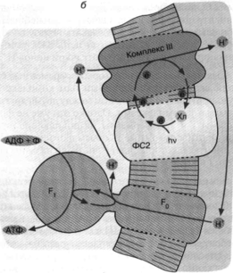 Рис. 5. Хлорофилльный фотосинтез зеленых сер­ных (а) и пурпурных (б) бактерий: а - хлорофилл, связанный с особым белковым комплексом - фо­тосистемой 1 (ФС1), возбуждается квантом света и отдает электрон по цепи электронных перенос­чиков на НАД+. Восстанавливаясь, НАД* связыва­ет внутриклеточный ион НГ. Потеря электрона на хлорофилле компенсируется окислением серово­дорода до серы и иона ИГ снаружи бактериальной клетки. Движение Н+ внутрь клетки через ком­плекс F0 F1 дает АТФ; б - хлорофилл, связанный с белком фотосистемы 2 (ФС2), поглощает квант света и запускает циклический перенос электро­нов. В этом процессе участвуют переносчики элек­тронов ФС2 и дополнительного белкового ком­плекса III. Перенос электронов комплексом III со­пряжен с откачкой ионов Н+ из клетки. Откачанные ионы I-Г возвращаются через комплекс F0 F, с об­разованием АТФ