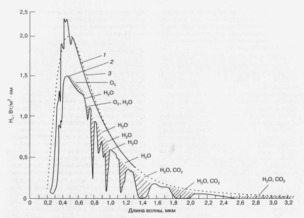 Рис. 1. Интенсивность падающего на Землю солнечного излучения (Н) в зависимости от длины волны. Заштрихованные области соответствуют ненаблюдаемым на уровне моря участкам спектра из-за их поглощения указан­ными компонентами атмосферы. 1 - Солнечное излучение за границей атмосферы, 2 - солнечное излучение на уровне моря, 3 - излучение абсолютно черного тела при 5900 К. (Справочник по геофизике и космическому про­странству. Под ред. С.Л. Валлея и Мак Гроу-Хилла, Нью-Йорк, 1965).