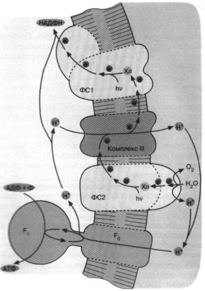 Следующим шагом в эволюции фотосинтеза стали, по-видимому, цианобактерии. Цепь перено­са электронов в этом случае представляет собой комбинацию: а) фотосистемы 1 зеленых бактерий, б) фотосистемы 2 и комплекса III пурпурных бакте­рий и в) дополнительного комплекса, расщепляю­щего воду на О2 и Н+ (рис. 6). Фактически донором электронов вместо сероводорода (встречающегося в достаточных количествах лишь в некоторых придан­ных нишах) служит вездесущая вода, запасы которой практически неограниченны. В результате конечный акцептор электоров — НАДФ+ восстанавливается, а вода окисляется. Образующийся НАДФН окисляется затем сложной системой восстановления угле­кислого газа до глюкозы. Таким образом, фотосин­тез цианобактерии параллельно с образованием АТФ дает углевод — одно из главных резервных ве­ществ современных живых клеток. Нет сомнений, что цианобактерия является эволюционным пред­шественником хлоропластов — органелл зеленых растений, энергетика которых устроена в основном по той же схеме, что показана на рис. 6.