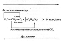 Как известно, фотосинтез растений заключается в преобразовании и запасании солнечной энергии, в результате которого из простых веществ — угле­кислоты и воды — синтезируются углеводы и выде­ляется молекулярный кислород. В общем виде этот процесс можно описать следующим уравнением (рис. 2).
