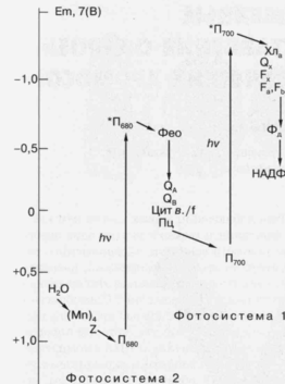 Рис. 5. Схематическое изображение фотосинте­тической цепи переноса электрона в хлоропласах растений и цианобактерий. (Мп)4 - Комплекс из четырех атомов Мп, связан­ных с белками реакционного центра фотосистемы 2 (ФС-2); Z - вторичный донор электрона ФС-2, (остаток тирозина); Пбао - первичный донор элек­трона ФС-2 (димер хлорофилла); *П680 - возбуж­денное состояние хлорофилла П680; Фео - первич­ный акцептор электрона ФС-2, феофитин; QA и QB -акцепторы электрона хиноновой природы; цит в./f-комплекс цитохромов, участвующих в переносе электрона от ФС-2 к фотосистеме 1 (ФС-1); Пц - пластоцианин (подвижный переносчик электро­на); П700 - первичный донор электрона ФС-1 (ди­мер хлорофилла); *П700 - возбужденное состоя­ние П700;Хла-(хлорофилл) и Ох-(хинон), соответ­ственно, первичный и вторичный акцепторы электрона ФС-1; Fx, Fa и Fb акцепторы электрона ФС-1 (Fe-S-центры); Фд - ферредоксинраство­римый переносчик электрона (Fe-S-содержащий белок); НАДФ+ - никотинамидаденин динуклеотид фосфат (конечный переносчик электронов, используемый вместе с АТФ в ассимиляции СО2), hv - квант света. По вертикальной шкале указаны приблизительные значения окислительно-вос­становительных потенциалов переносчиков элек­трона при рН 7.