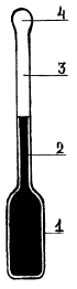 идкостный термометр состоит из стеклянных баллона 1, капиллярной трубки 3 и запасного резервуара 4 (рис. 1). Термометрическое вещество 2 заполняет баллон и частично капиллярную трубку. Свободное пространство в капиллярной трубке и в запасном резервуаре заполняется инертным газом или может находиться под вакуумом. Запасной резервуар или выступающая за верхним делением шкалы часть капиллярной трубки служит для предохранения термометра о порчи при чрезмерном перегреве.