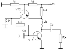 В данной схеме транзистор VT2 используется в качестве элемента термостабилизации. Ток коллектора VT2 является базовым током смещения. Здесь