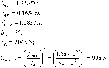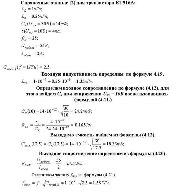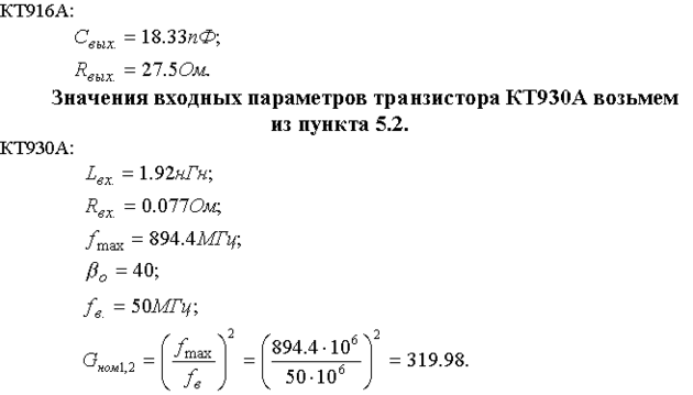 Значения выходных параметров транзистора КТ916А возьмем из пункта 6.2, где рассчитана эквивалентная схема этого транзистора.