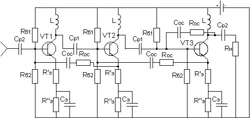 Как видно из расчёта мы имеем запас по полосе пропускания, но не достаточный коэффициент усиления. Поэтому возьмём три каскада см. рис.(2.3.2), тогда по формулам (2.3.1) и (2.3.4) соответственно получим: