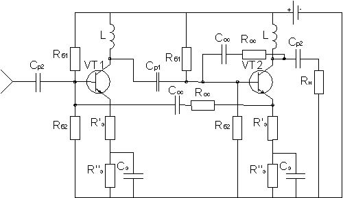 Поскольку мы будем использовать перекрёстные обратные [1],[3], то все соответствующие элементы схемы будут одинаковы, т.е. по сути дела расчёт всего усилителя сводится к расчёту двух каскадов рис.(2.3.1). Достоинством данной схемы является то, что при выполнении условия схема оказывается согласван-ной по входу и выходу с КСВН не более 1,3 в диапазоне частот, где выполняется условие 0,7. Поэтому практически отсутствует взаимное влияние каскадов друг на друга при их каскадировании Количество каскадов будет зависеть от требуемого Кu и полосы пропускания, которые можно определить как: