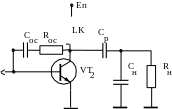 Сопротивление обратной связи Rос находим исходя из заплонированного на выходной каскад коэффициента усиления, в разах, сопротивления генератора или другими словами выходного сопротивления предыдущего каскада и рассчитываем по следующей формуле [2]: