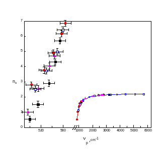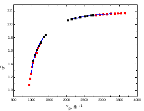 На рис.13. изображена дисперсия обыкновенного показателя преломления полидоменного кристалла ниобата лития No.2 на верхней поляритонной ветви, которая получена по перестроечным кривым рис.10,11. Эта дисперсия используется при вычислении волнового вектора обратной решётки, соответствующей доменной структуре кристалла. Так как при нелинейной дифракции в условие пространственного синхронизма входят четыре волновых вектора, то для этого явления доступна более обширная частотная и угловая область при параметрическом рассеянии, чем для линейной дифракции. Векторная диаграмма этого взаимодействия изображена на рис.12. Волновой вектор обратной решётки можно получить из уравнений: