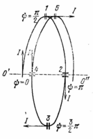 При таком коэффициенте замедления токи в любых двух сечениях, расположенных под углом 90° (например, в 1 и 2, 2 и 3, 3 и 4, 4 и 5), вызывают на оси О'О" поля, которые сдвинуты по фазе на 90°, и волны, которые поляризованы под углом 90°. В результате сложения этих линейно-поляризованных волн получаются волны с круговой поляризацией.