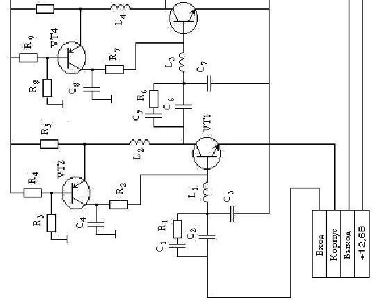 Усилитель имеет запас по усилению 8дБ. Это нужно для того, чтобы в случае ухудшения усилительных свойств коэффициент передачи усилителя не опускался ниже заданного уровня, определённого техническим заданием.